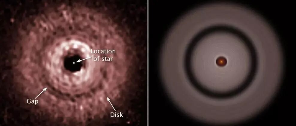 ○ 这张哈勃图像(左)显示了一个由尘埃和气体组成的原行星盘的缝隙,它围绕着附近的红矮星长蛇座TW旋转。| 图片来源:NASA、ESA、J. Debes、H. Jang-Condell、A. Weinberger、A. Roberge、G. Schneider 和 A. Feild
