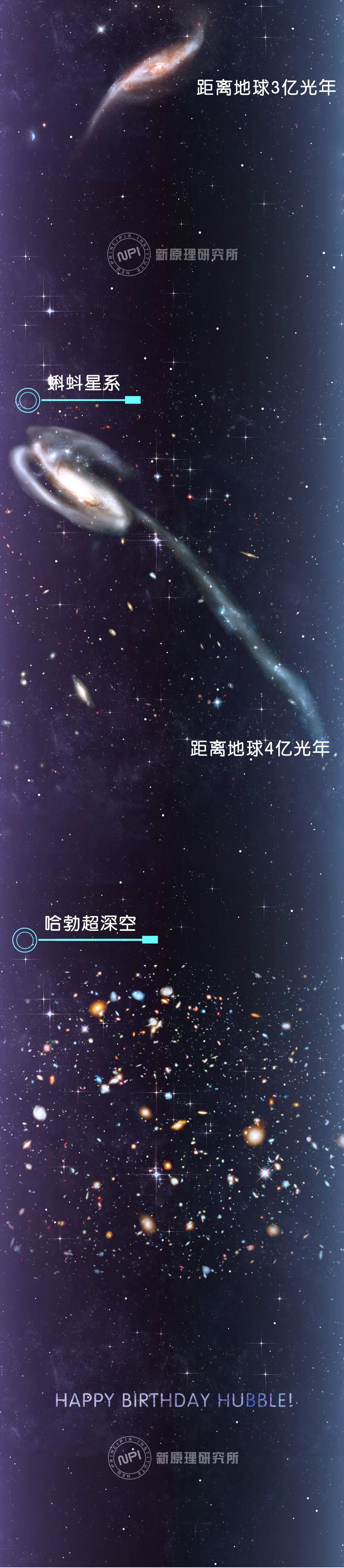 就像在剪贴簿中记录孩子的成长一样,HST捕捉了许多演化中的星系的外观。这之所以可行是因为当HST观测到越来越远的深空时,它回溯的时间也就越久远。相比于今天巨大的旋涡星系和椭圆星系,HST探测到的那些最远、最早的星系要更小,形状也更不规则。通过仔细研究在宇宙不同时期的星系,天文学家可以看到星系是如何随着时间的推移而演化的。