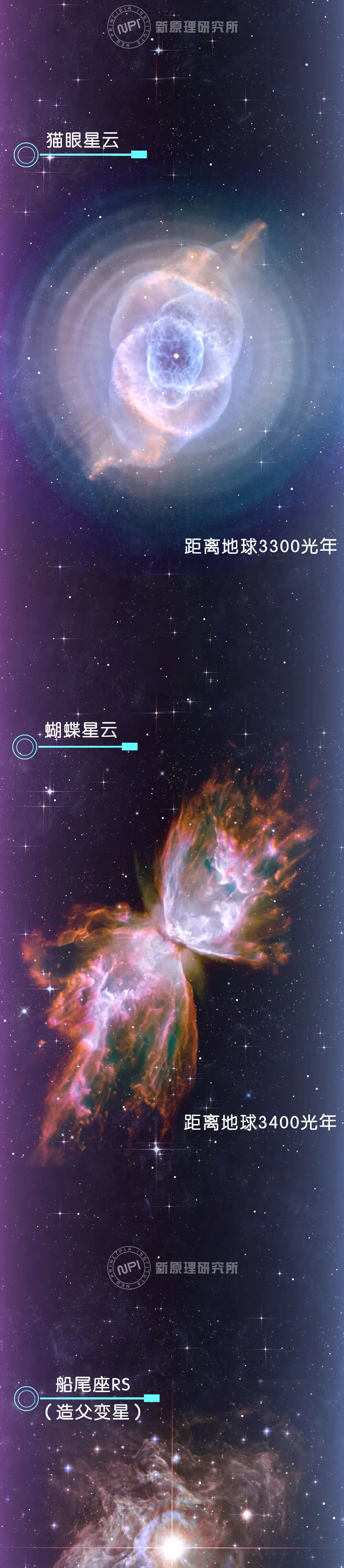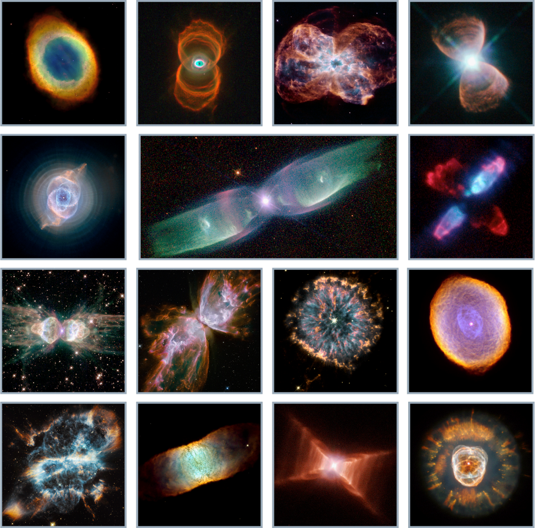 当类似太阳的恒星步入生命的最后阶段时,就会形成行星状星云。之前来自地面望远镜的照片表明,行星状星云大多是简单的球形。然而HST捕捉到了这些天体的前所未有的细节,结果表明它们的形状实际上更加多样和复杂:有些像风车,有些像蝴蝶,还有一些像沙漏。这些图像让天文学家得以洞察恒星在坍缩形成白矮星之前释放外层气体时的复杂动力学。