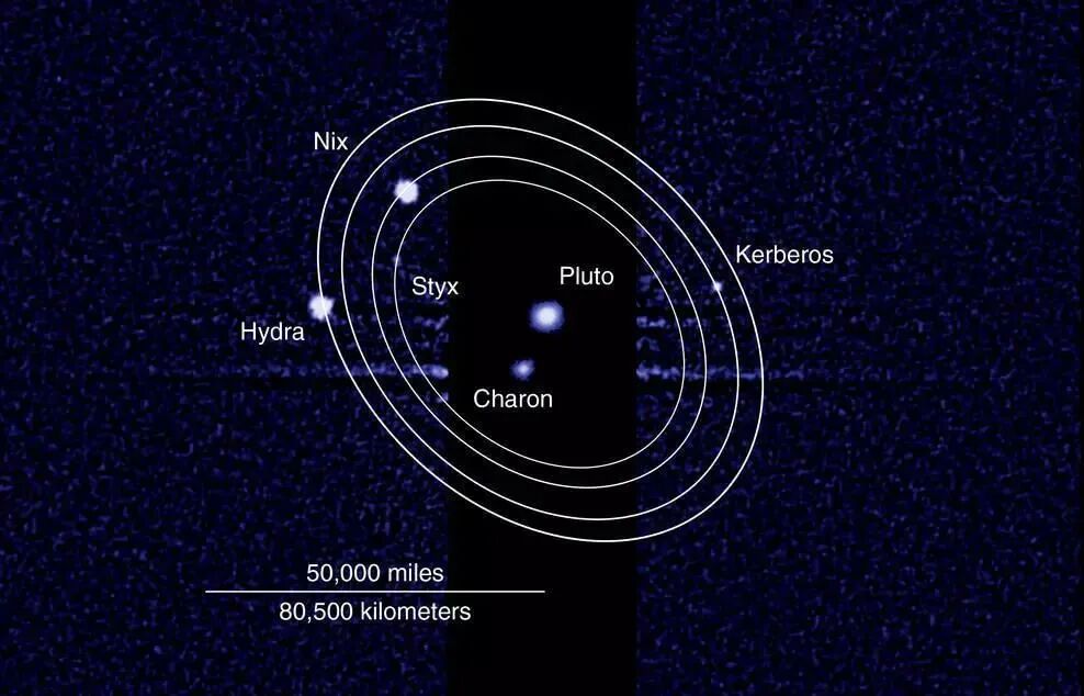 在探测太阳系外围的矮行星冥王星时,HST发现,有四颗此前不为人知的卫星在围绕着这颗冰冷的星球运行。首先发现的是小卫星Nix和Hydra,然后是更小的Kerberos和Styx。天文学家最近发现,Nix和Hydra在围绕冥王星旋转时,它们的轨道非常混乱且不可预测。