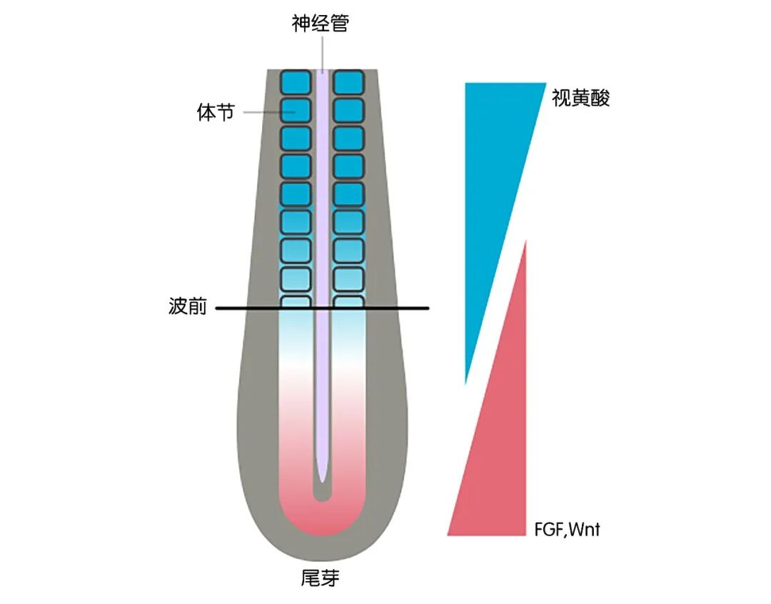 这把尺子是双向梯度变化的。靠近头部的细胞产生大量视黄酸,而位于尾部的细胞则产生另外两种化合物,分别是FGF和Wnt。它们会沿着身体扩散,因此不同部位“分到”的化学物质含量各不相同。举个例子来说,一个相对更靠近头部的细胞会“知道”它的位置,因为它沐浴在大量视黄酸中,却没有很多的Wnt或FGF。