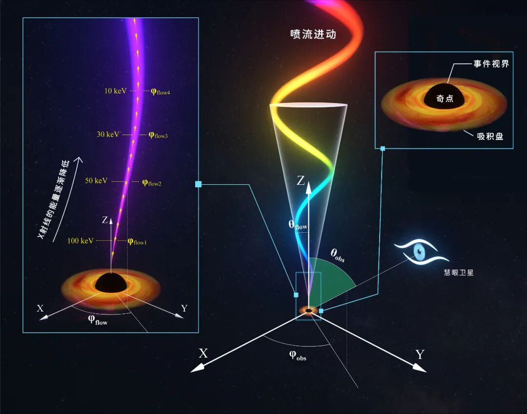 但这一次,慧眼卫星的观测将喷流的源头定位到距离黑洞上百公里(几倍黑洞视界半径)的区域,这是迄今为止观测到的距离黑洞最近的相对论喷流!