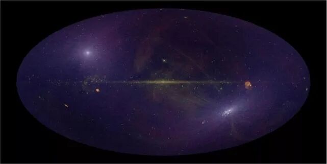 eROSITA望远镜的第一张光图像是在所有七个望远镜模块的一系列曝光中获得,银河系邻近星系大麦哲伦云(LMC)和距离约8亿光年相互作用星系团A3391/3395系统的综合时间约为一天。在银河系邻近的星系中,LMC,eROSITA不仅显示了LMCs扩散热气体的分布。而且还显示了一些值得注意的细节,例如像SN1987A这样的超新星遗迹。