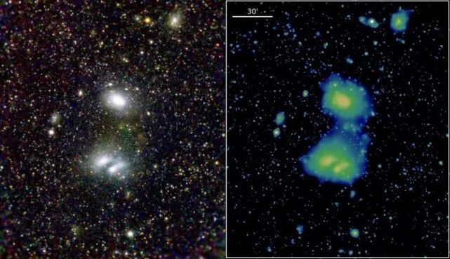 可见光显示了恒星所追踪星系的结构,但X射线主要是由中心生长的超大质量黑洞控制。在用光学望远镜看到星系团的地方,X射线揭示了巨大气体储存库填充了它们之间的空间,并追踪出宇宙的暗物质结构。随着其性能的证明,天文学家现在知道eROSITA望远镜将促使我们在理解充满活力的宇宙演化方面取得突破。进一步深入宇宙,A3391/3395相互作用的星系团系统eROSITA图像突出了促使宇宙中巨大结构形成的动力学过程。这些星团在eROSITA图像中显示为巨大的椭圆形星云,横跨数千万光年,每个星系团包含数千个星系。