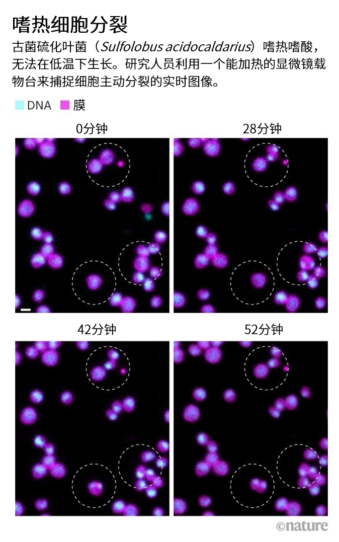 英国医学研究委员会分子生物学实验室的细胞生物学家Buzz Baum对嗜热嗜酸的硫化叶菌(Sulfolobus acidocaldarius)的细胞分裂很感兴趣。但Baum说,活的培养物在显微镜载物台上,就和一杯茶凉得一样快,这些细菌接着就进入了假死状态。“我们做了好几年都没有成功。”