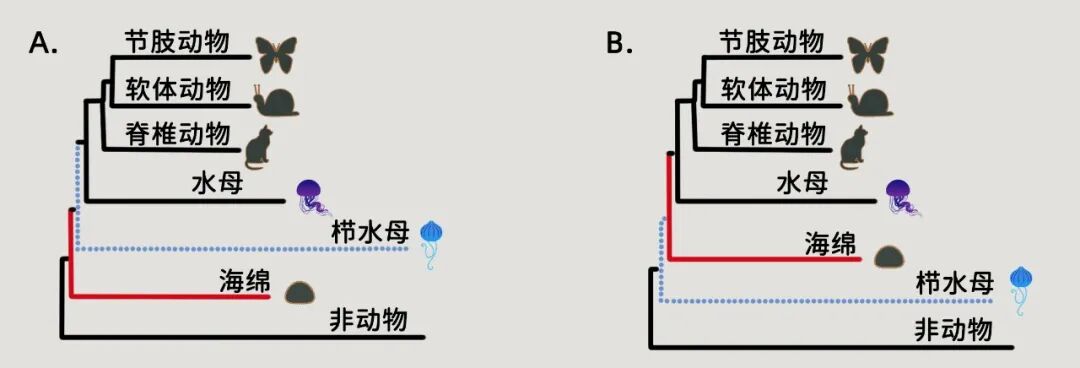 两种不同的系统发生树,A所示的进化树表示最早出现的动物是海绵,B所示的进化树表示最早出现的动物是之水母。| 图片参考:Telford & Kapli