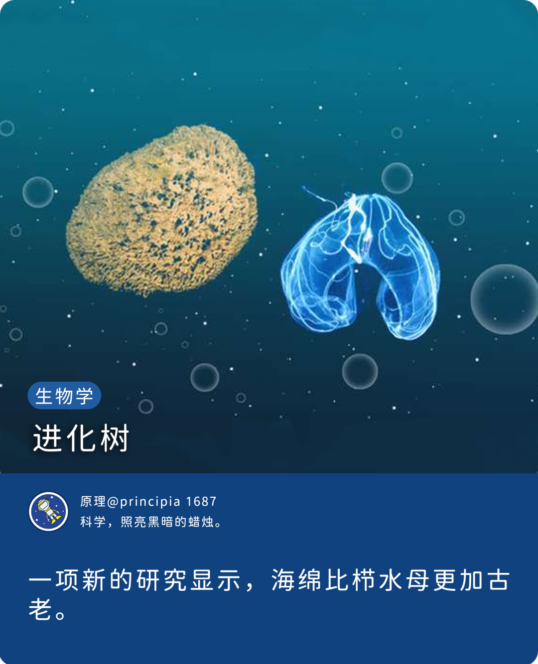 那么,到底是谁更早出现的呢?一种可能的情况是,那些表明了栉水母最先出现的基因分析,实际上可能没有考虑到使栉水母看起来比实际年龄更老的偏差。而将这一因素纳入了考量的新研究表明,海绵才是是我们最遥远的动物亲缘。