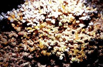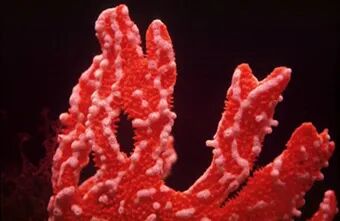 白色的纽扣珊瑚的珊瑚虫寄生在海绵 Trikentrion flabelliformis (红色)上。图片来源:John Hooper, QM