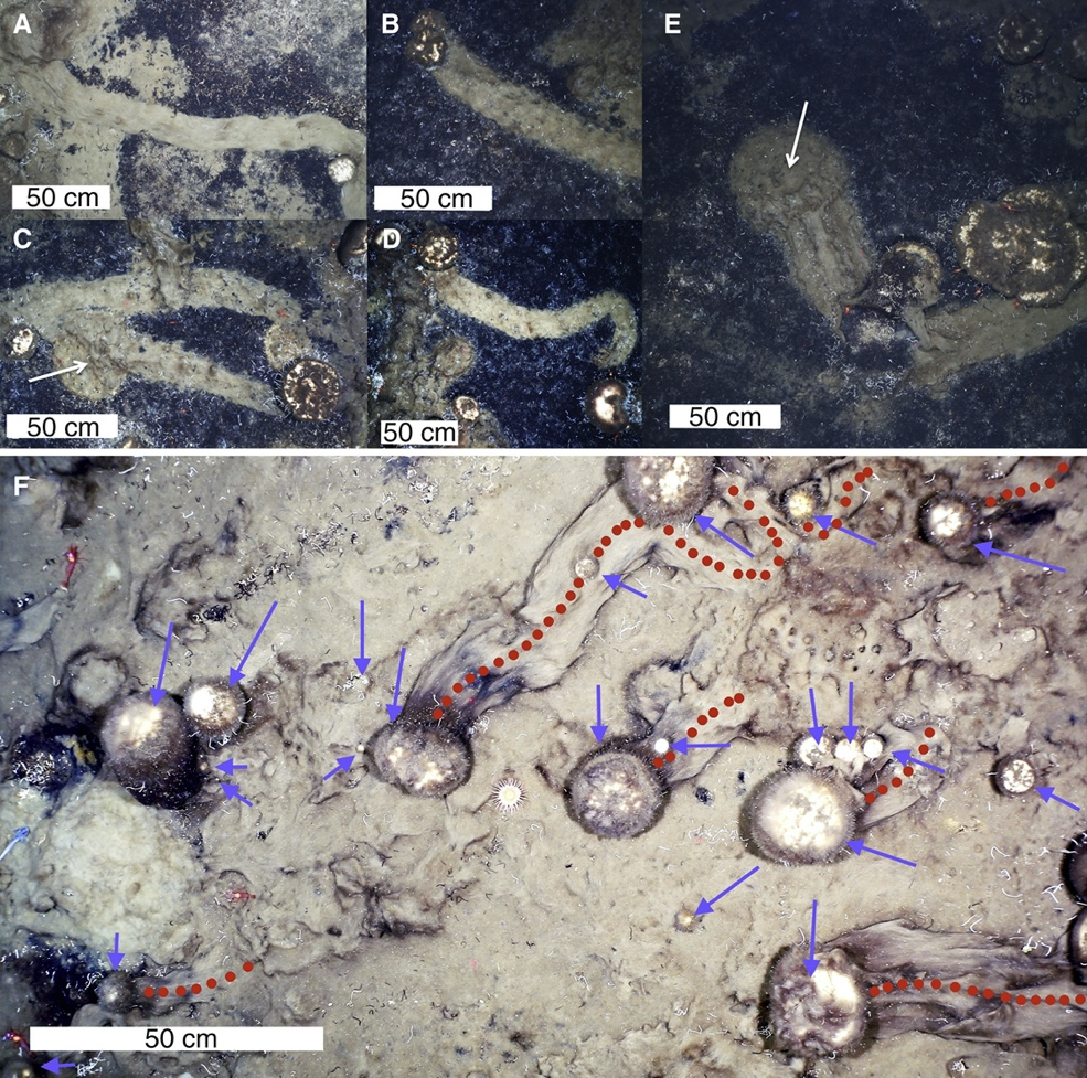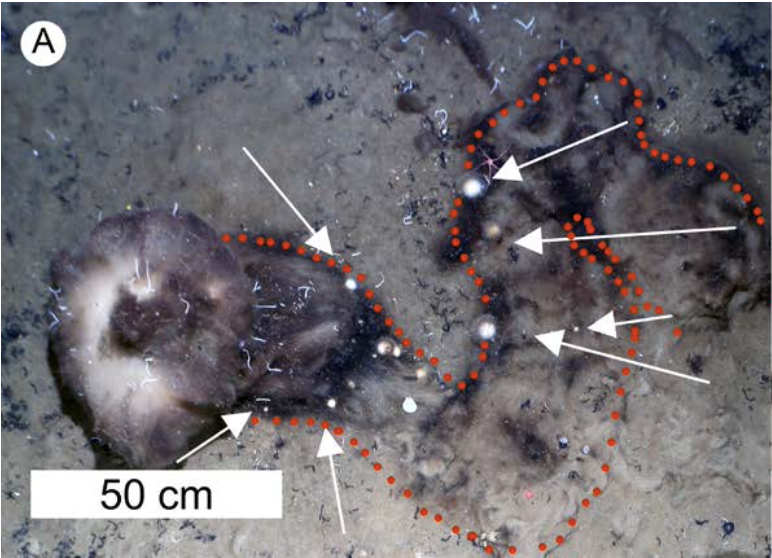 更令人惊奇的是,研究团队在分析获得的影像资料时,发现在70%的海绵照片中都出现了高数厘米、长数米的棕色痕迹。尤其在海绵较少的地方,海床上原本的沉积物和有机物残骸较少,因此可以清晰地看到,棕色痕迹纵横交错地分布在海床上。研究人员发现,这些棕色痕迹其实是海绵的骨针,也就是海绵的支撑结构,有些骨针上还附着少量的海绵组织。顺着这些痕迹,研究人员发现,有些骨针甚至直接与海绵的底部或侧面相连。这表明这些骨针可能是海绵在移动过程中留下的。