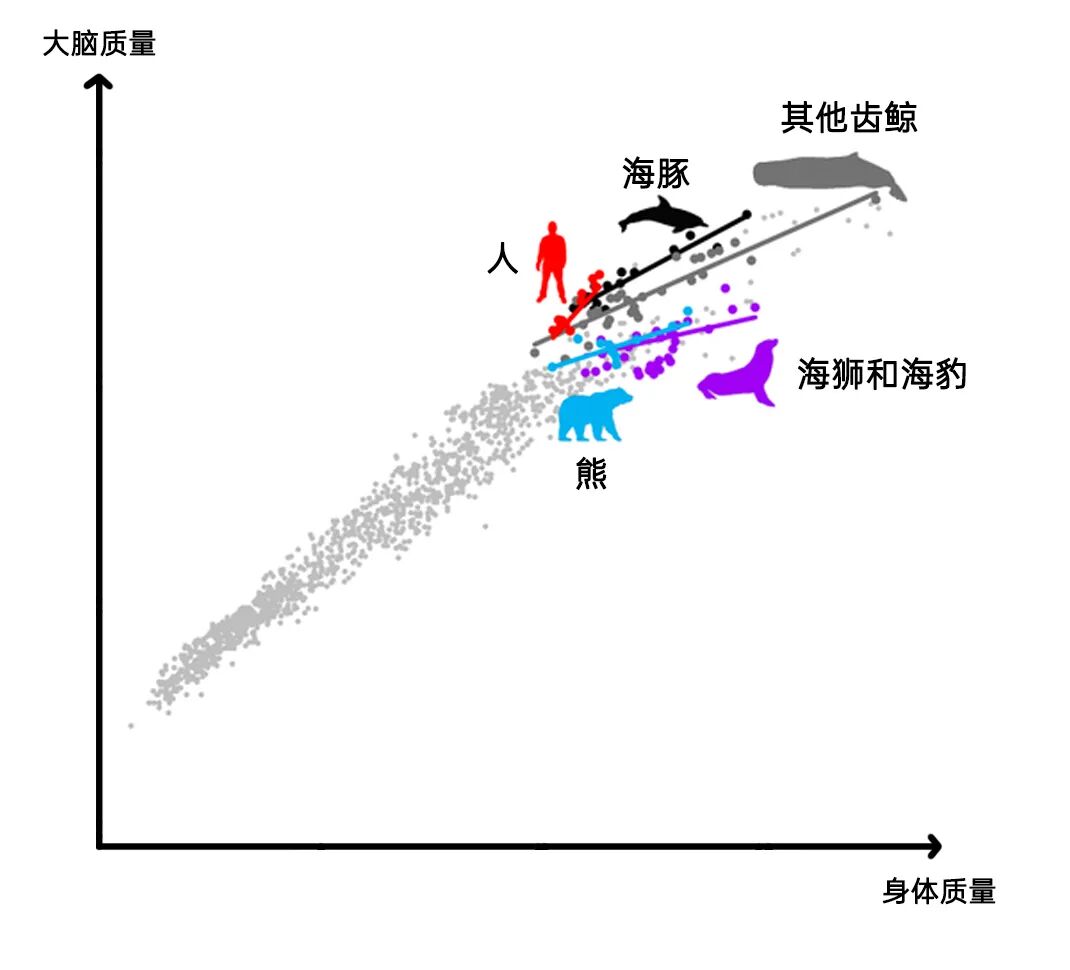 相比之下,作为地球上大脑最大的哺乳动物,人类和海豚与它们的近亲——黑猩猩和其他齿鲸相比——大脑虽大但身体更小了。这使得它们的大脑在哺乳动物中显得格外大。
