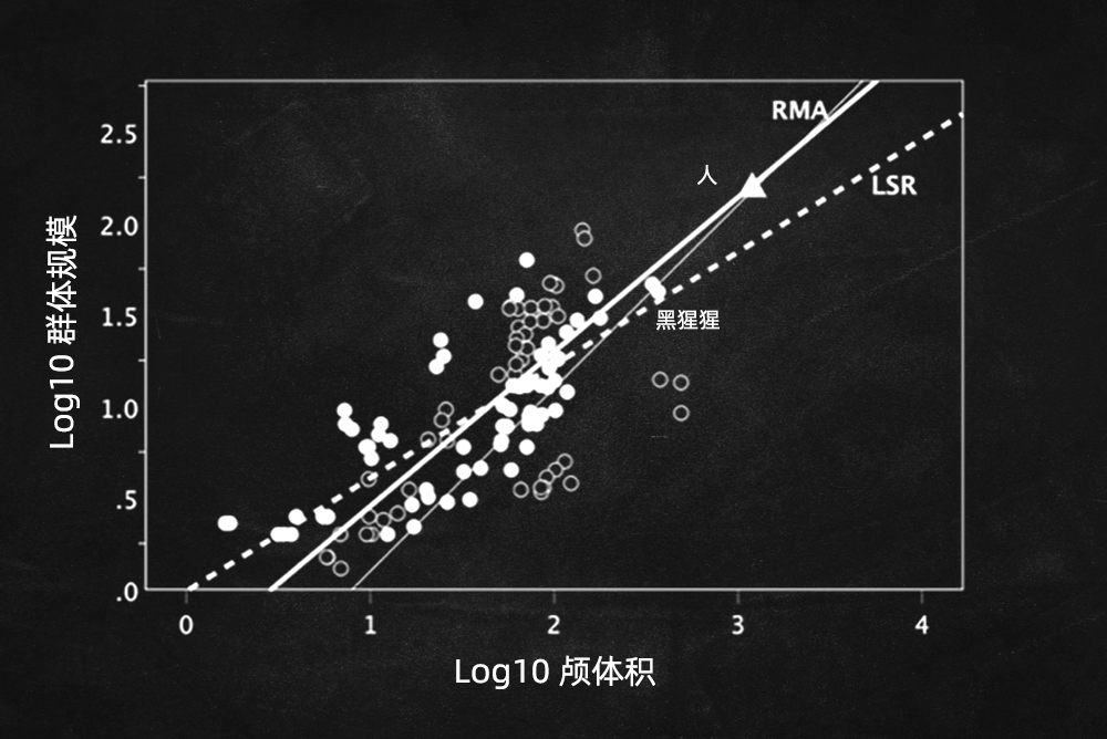 Robin Dunbar展示的一张用RMA和LSR分析法会得到不同结果的例子。| 图片来源:Robin Dunbar