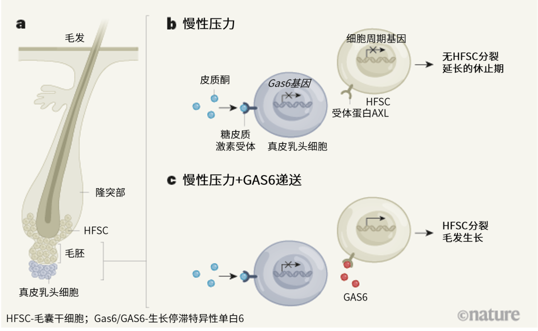 为了解真皮乳头如何将压力信号传递给HFSC,作者对在真皮乳头中表达的信使RNA(作为蛋白质生产的模板)进行了分析,表明一种名为生长停滞特异性6(GAS6)的分泌蛋白可以作为候选的分子信使。实际上,使用腺病毒载体(基因治疗中的常用工具)将GAS6递送至皮肤中不仅刺激了正常小鼠的毛发生长,而且还恢复了慢性应激或皮质酮喂饲期间的毛发生长。