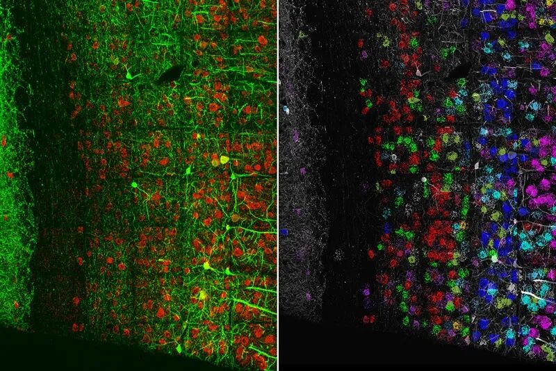膨胀显微成像联合RNA测序(左)共同揭示了小鼠视觉皮层神经元的结构(右)。  来源:S. Alon et al./Science