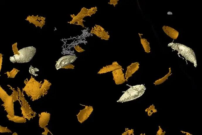Qvarnström和同事们在奥济梅克(波兰西南的城镇)附近的一个黏土坑中发现了一枚一角硬币大小的粪化石。科学家们对西里龙所处的三叠纪食物网很感兴趣,所以他们用同步辐射微断层扫描成像技术(synchrotron microtomography)记录了这块不透明化石的内部组成。其中,X射线从各个方向射入化石,清晰地呈现了其内部组成情况。将生成的图像文件以数字化方式拼接到粪化石内部的3D模型中是一项很费力的工作,但当那些甲虫的细节最终呈现在Qvarnström面前的时候,他惊呆了:“它们就好像在你面前活了过来了一样。”