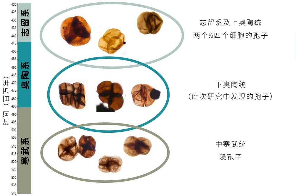 研究人员从早奥陶世(4.7亿至4.85亿年前)的纳姆贝特组中提取了岩石样品后,发现了具有典型规则排列的两个或四个细胞的陆地植物孢子。