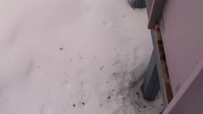 如果冬天还没过去,那必须要抓好时机,毕竟温度可是会要命的。所以一般会在蜂巢附近解决,拉完就快跑回家。下面这个老哥就发现蜜蜂在1月份集体出动,组队出门上厕所,白雪上被点缀了点点黄色蜜蜂屎: