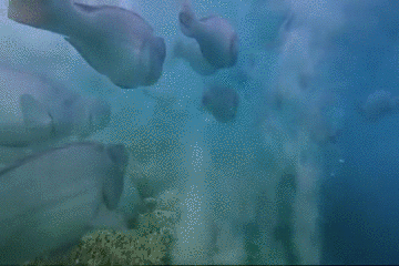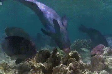 下面这条面部粉嫩的名叫隆头鹦嘴鱼,它们喜欢吃珊瑚礁上的藻类植物: