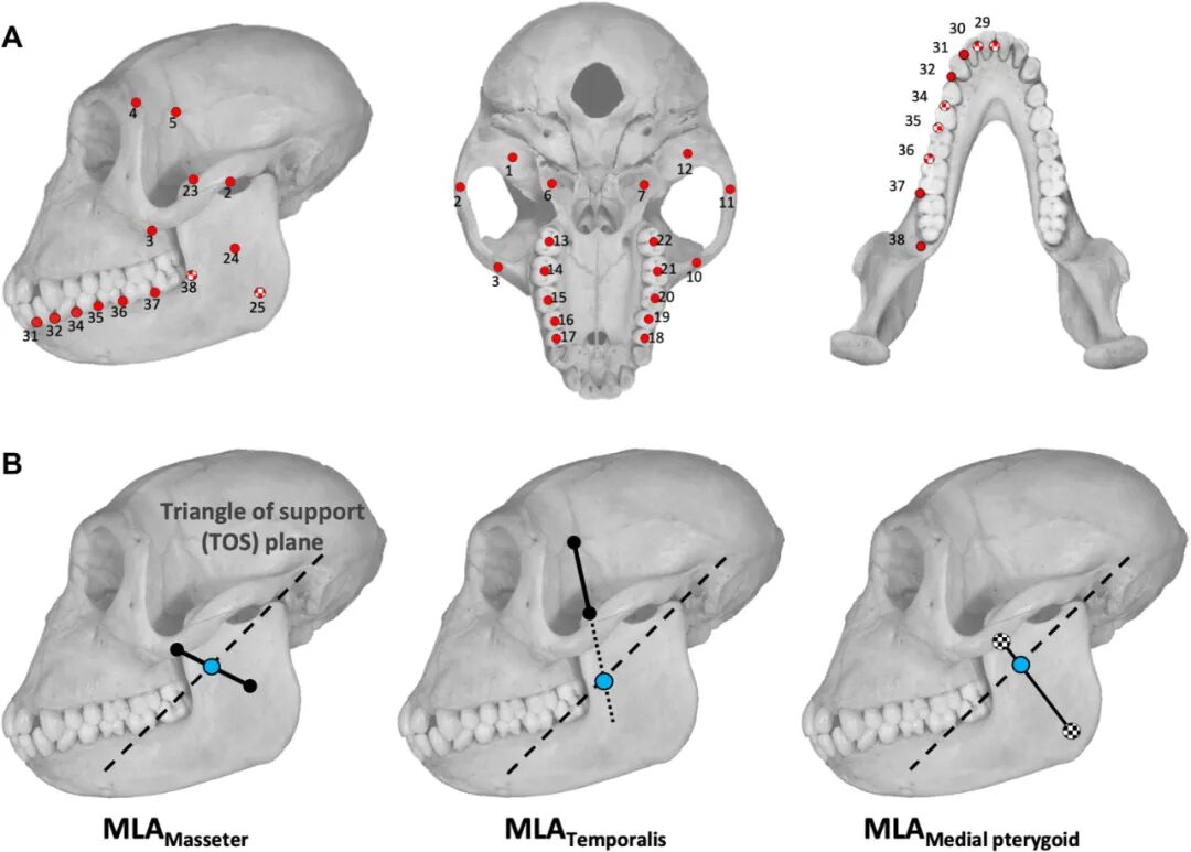 一个3D模型中有38个标志位,包括牙齿的位置和各种咀嚼肌的起止点。它们的三维坐标反映了头骨尺寸和咀嚼系统的结构。另外,模型还体现了咀嚼肌的力学信息,也就是肌肉的作用线。