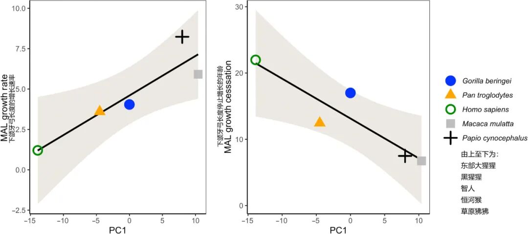 在研究中,他们发现有一组指标与下颌牙弓长度的增长速率有显著相关性,这组指标与下颌牙弓长度停止增长的年龄也有显著相关性。而这组指标包含了脑的大小、首次生育的年龄、两次生育的时间间隔,以及妊娠所需时长等等与生命节奏相关的信息。