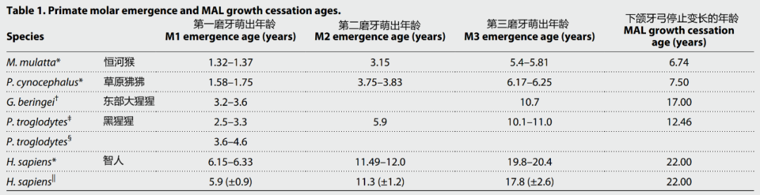 也就是说,人类每一颗磨牙萌出的时间都比较晚,整个磨牙进度条都比其他灵长类动物要慢。