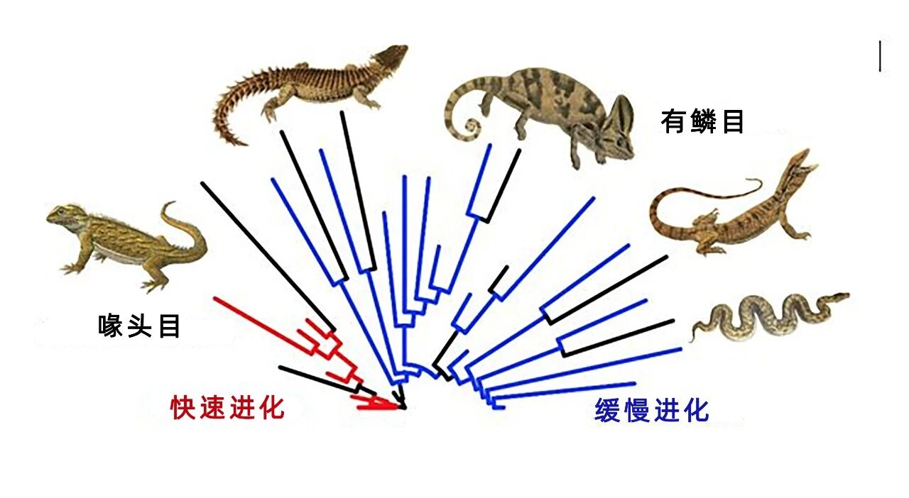 在这次研究之前,研究人员原本期待会在喙头目动物身上发现缓慢进化的痕迹,而在有鳞目动物身上发现快速进化的痕迹。然而,他们观察到的情况正好与预期相反。他们发现在有鳞目的前三分之二的进化史中,都有着缓慢的进化率;而其姐妹进化分支——喙头目,虽然如今只由一个物种组成,但在过去却显示出了快速的进化率