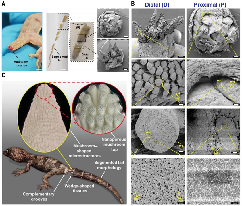 在扫描电子显微镜下,这些蜥蜴尾巴的断面均显示出层级特征:在亚毫米尺度上,每个断面远端的楔形肌肉组织上布满了蘑菇状的微柱;同时,这些微柱表面还密集排布着大量纳米孔。