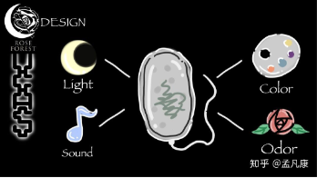 在故事中,夜莺于月光中吟唱, 用生命化作鲜艳而芬芳的玫瑰;在项目中,我们将故事里的四个元素--月光、夜莺歌声、玫瑰颜色与气味分别提取出来, 实现由光信号和声信号输入, 呈现出一幅由被改造的大肠杆菌创作带有香气的玫瑰画作