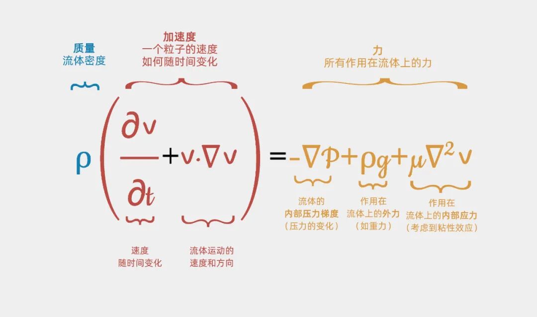 这是一组非线性偏微分方程,描述了黏性、不可压缩的流体,在给定的黏度、集体速度和外部压强下如何运动。可以这么简单理解,它就好像牛顿第二定律的流体版本。牛顿第二定律连接了加速度与作用力,而NS方程则将流体速度的变化率与作用于流体上的力联系了起来