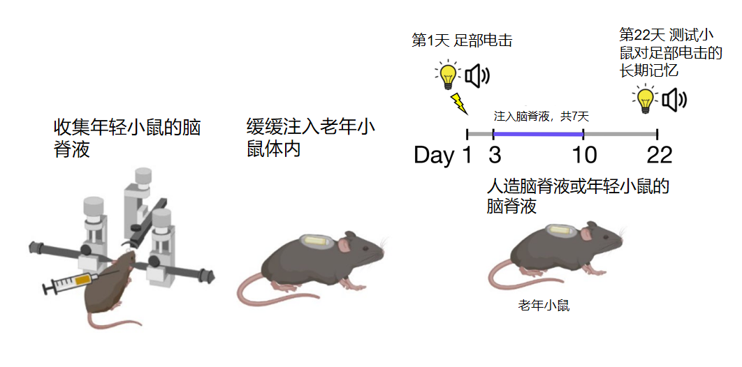 为了测试老年小鼠海马体的学习和长期记忆能力,早在以上过程开始的2天前,研究人员就让其中的老年小鼠遭受了伴随有声音、闪光的足部电击,并作为实验开始的第1天,随后的3~10天注射脑脊液,在3周之后,重复电击实验。如果小鼠听到声音和看到闪光后,能想到马上会有电击,就代表它们形成了长期记忆。