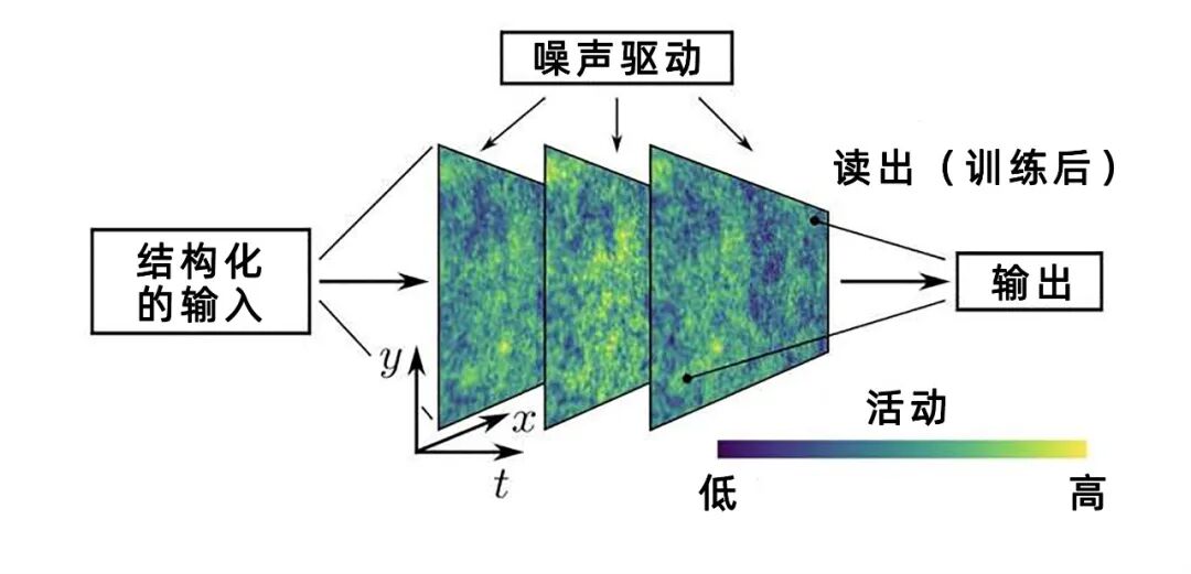 图片说明了对模型计算能力的研究。一种刺激(结构化的输入)被添加到系统中(带有空间坐标x和y),它随着时间t演变,同时网络也被随机输入(噪声驱动)所驱动。一个线性读出被训练为从系统活动的快照中重建或分类输入刺激。重建任务测试了系统的记忆,而分类任务则需要非线性互动。图中的绿色“马赛克”是数值模拟的截图,黄色像素代表高活动性,蓝紫色像素代表低活动性。(图/Tiberi et al.)