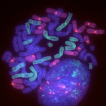某只四倍体单性钝口螈有来自3个不同物种的染色体,绿色属于Ambystoma laterale,蓝色属于A. jeffersonianum,粉色属于A. barbouri。图片来源:doi.org/10.1038/hdy.2009.83