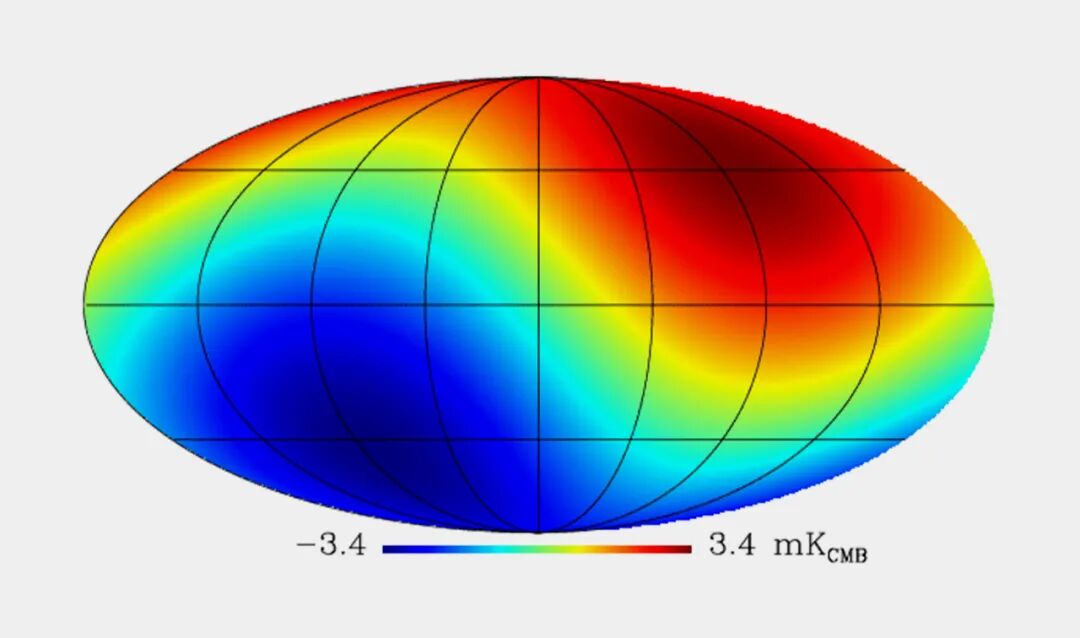 CMB的数据实际上还可以揭示出更多信息。比如,它展现出了一种偶极各向异性的特征,简单来说,它在我们运动的方向上看起来更“暖”,而在远离我们运动的方向上显得更“冷”。