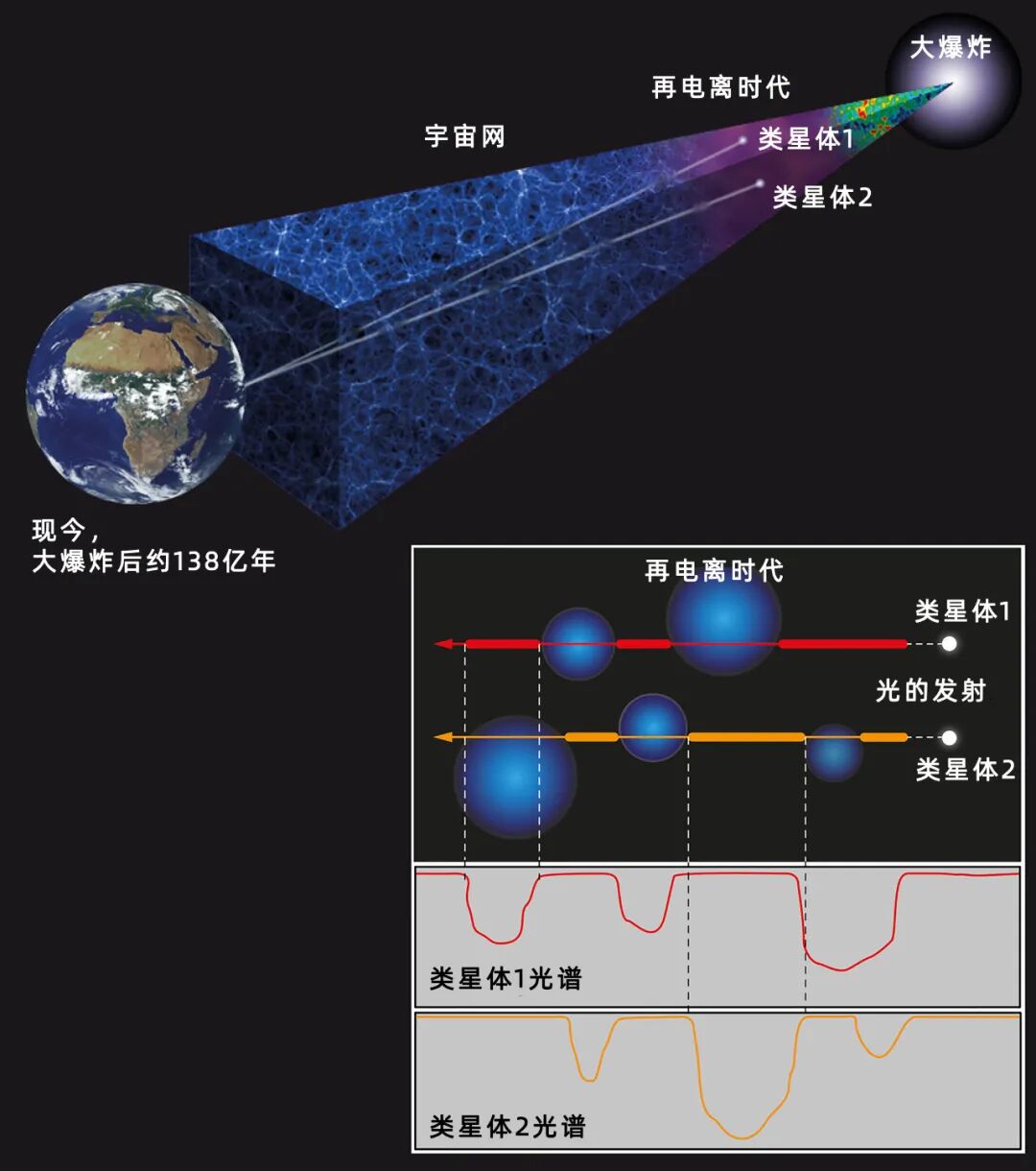 类星体的光在它的旅途中会穿过许多不同的氢云,每一片氢云都会在紫外范围内留下它微小的红移印记。理论上来说,分析每条红移线的吸收和传输变化,就可以得出氢气完全电离的时间或者距离。