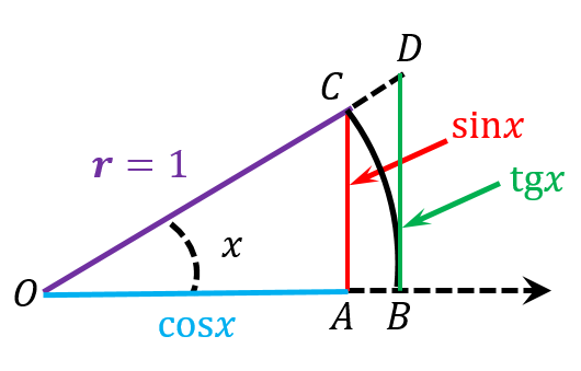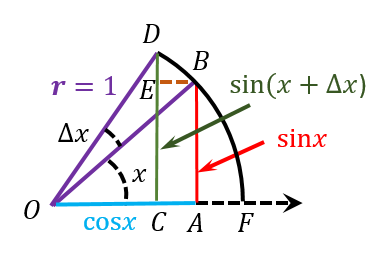 从B点作CD的垂线BE,则  即为  的增量,而弧  即为  的增量,故有当  时,弧  就是  ,上式即 上式左边就是角  的正弦值,也就是角  的余弦,而  与弧  的张角  相等,故上式左边等于  ,因此就得到 这就得到了弧度制下的情形。