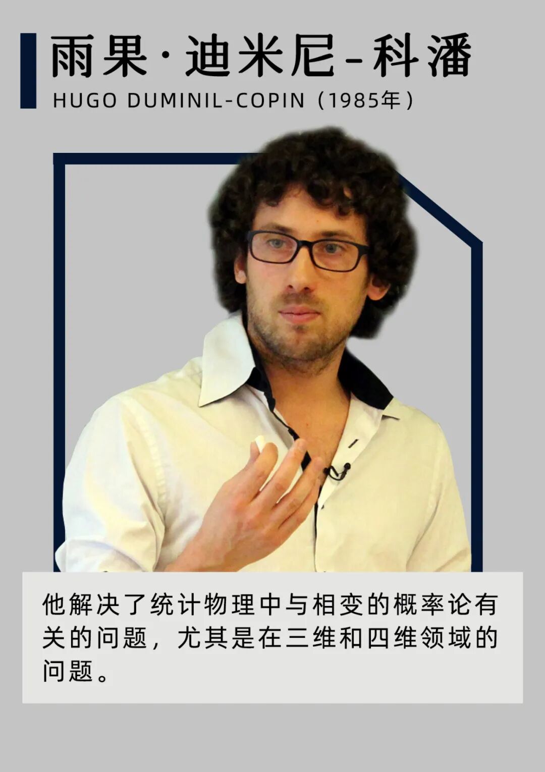 雨果·迪米尼-科潘改变了统计物理学中与相变有关的数学理论,他解决了几个长期存在的开放性问题,尤其是在三维和四维以及在二维的不可积的情况下。他的工作开辟了几个新的研究方向。在这里我们只列举他在这一领域的众多成果中的一小部分。