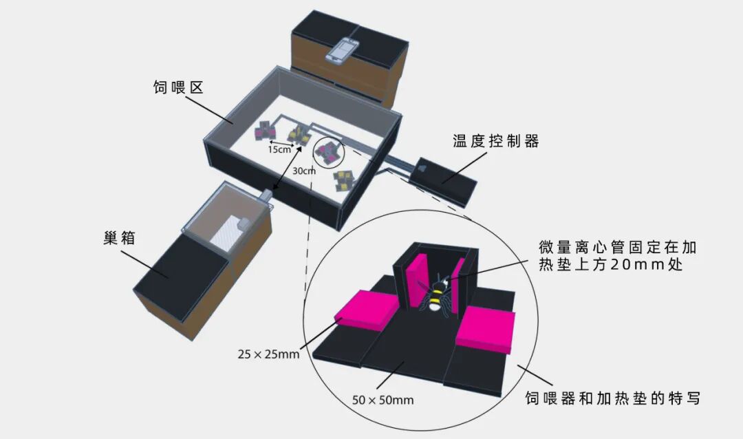 在实验中,41只熊蜂要在未经加热或“有害”加热(55℃)的饲喂器之间进行选择。这些饲喂器中放上了不同浓度的蔗糖,并以不同的颜色标记。