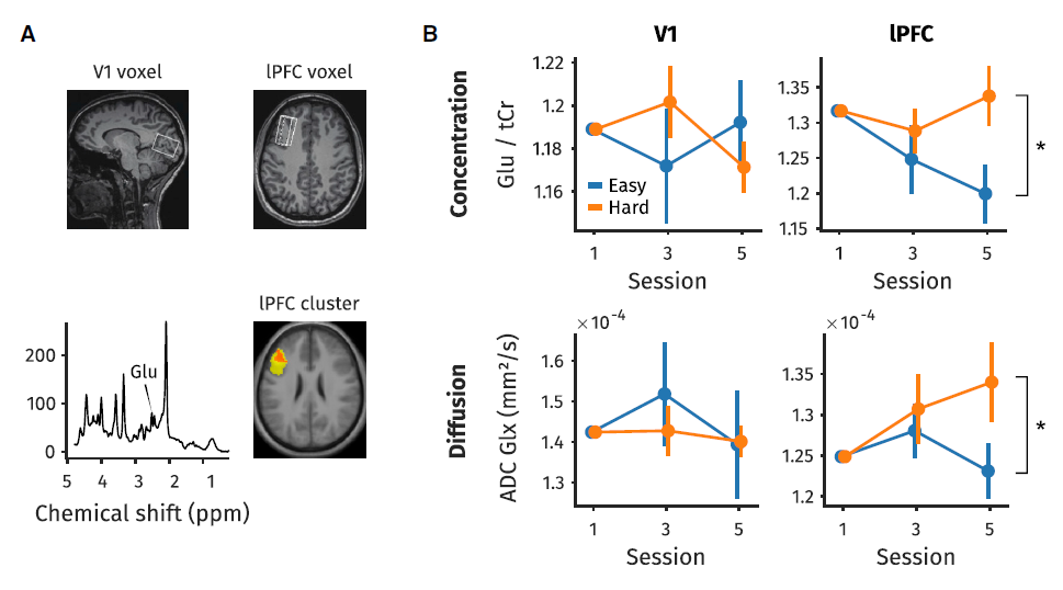 在完成任务过程中的三个阶段,研究人员使用磁共振波谱(MRS)来量化神经组织中的代谢物。