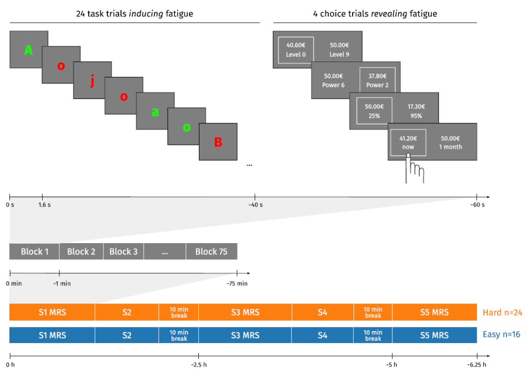 为了寻找证据,在这项新研究中,研究人员招募了40名参与者,并将他们分为两组:困难组和简单组。在6.25个小时内,所有参与者被要求执行诱导认知疲劳的两个认知控制任务。实验期间只有两次10分钟的休息时间。两组任务中,参与者或根据字母的颜色区分元音与辅音或大小写字母;或完成经济决策任务,例如是否现在收到41.20欧元,还是在一个月后收到50欧元。