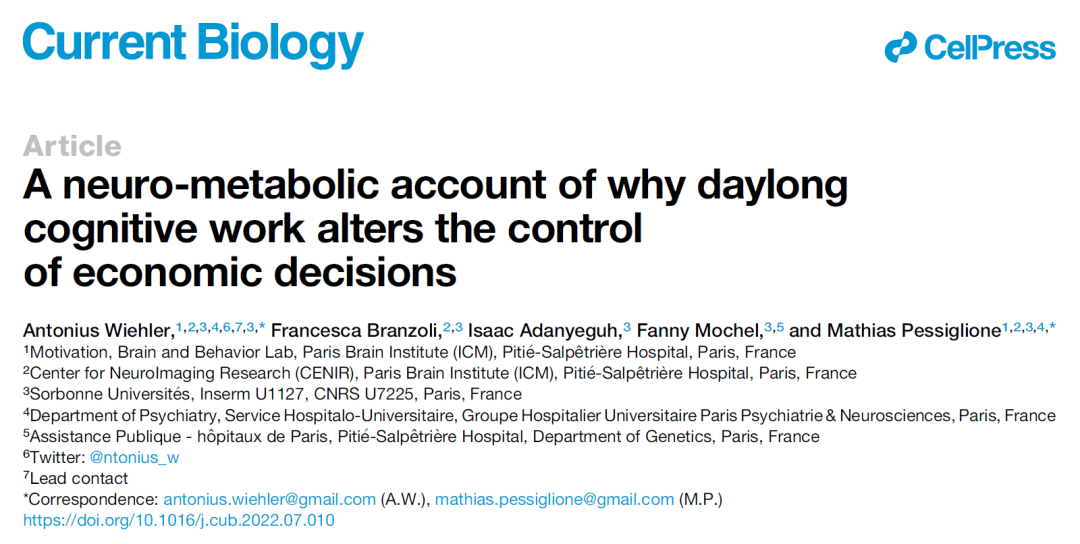 2022年8月11日,巴黎 Pitié-Salpêtrière 医院、巴黎大脑研究所的研究人员在 Cell 子刊 Current Biology 上发表了题为:A neuro-metabolic account of why daylong cognitive work alters the control of economic decisions 的研究论文。