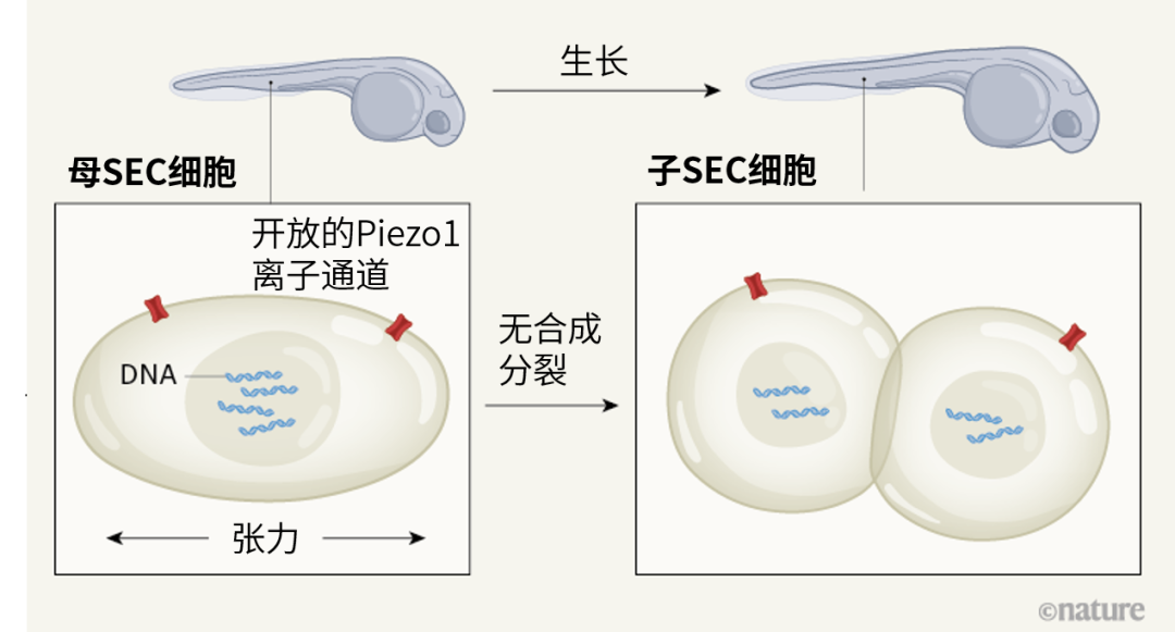 斑马鱼幼鱼有一个快速生长期,此时其皮肤的表面上皮细胞(surface epithelial cell,SEC)数量必须迅速增加,才能构成生物体与外界之间的保护屏障。陈振辉等人[1]报道,斑马鱼幼鱼皮肤扩张过程中的张力使表面上皮细胞能在不复制其DNA的情况下进行分裂(通过涉及离子通道蛋白Piezo1开放活性的未明机制)。这种“无合成分裂”(asynthetic fission)所产生的子细胞比它们的母细胞更平、更小,DNA等生物材料也比母细胞要少。但是,它们总的表面积更大,能保障对生长中幼鱼的体表覆盖。