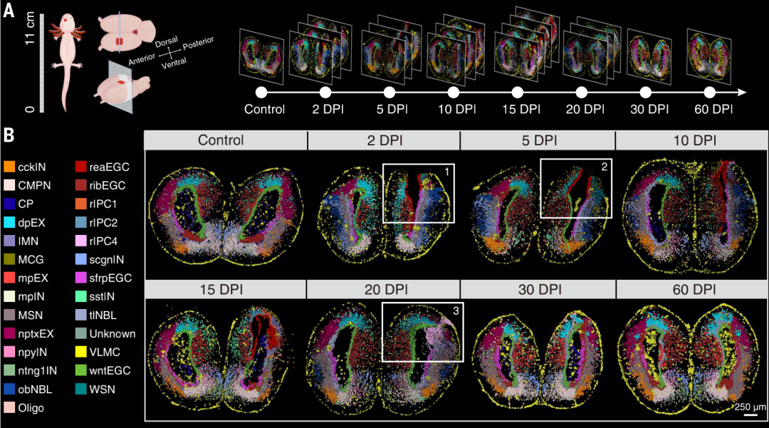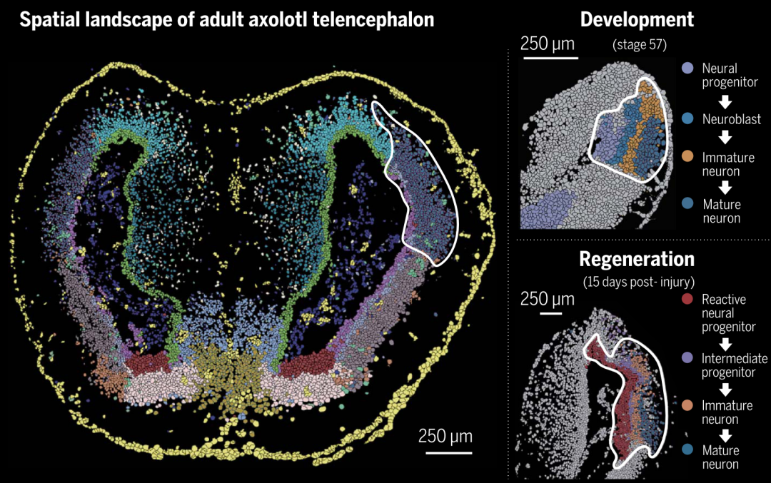 空间转录组数据突出了轴突动物端脑在发育和损伤引起的再生过程中的细胞和分子特征。对上皮细胞的激活和功能调控的进一步表征可能产生对改善哺乳动物大脑再生能力的见解。