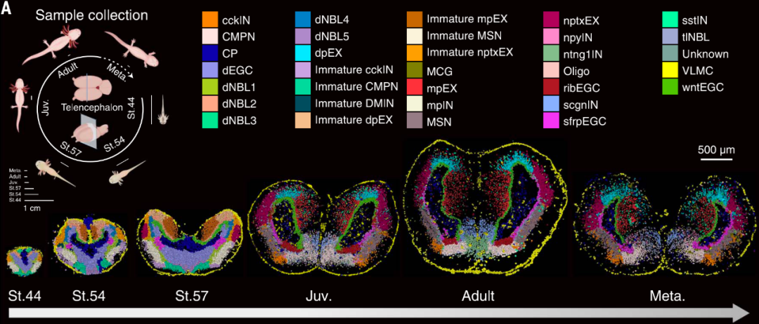 通过使用Stereo-seq,科学家生成了一组端脑切片的空间转录组数据,涵盖了蝾螈的六个发育阶段和七个损伤诱导再生阶段。