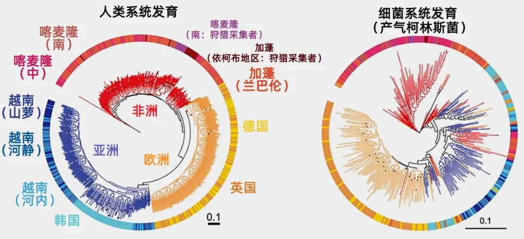 将人类与微生物的系统发育树比较后发现,它们的匹配程度呈现一种梯度。一些细菌的系统发育树与人类的完全不匹配;还有一些则匹配得相当好,表明这些物种与人类共同多样化。事实上,一些微生物物种在几十万年间一直在共同进化。
