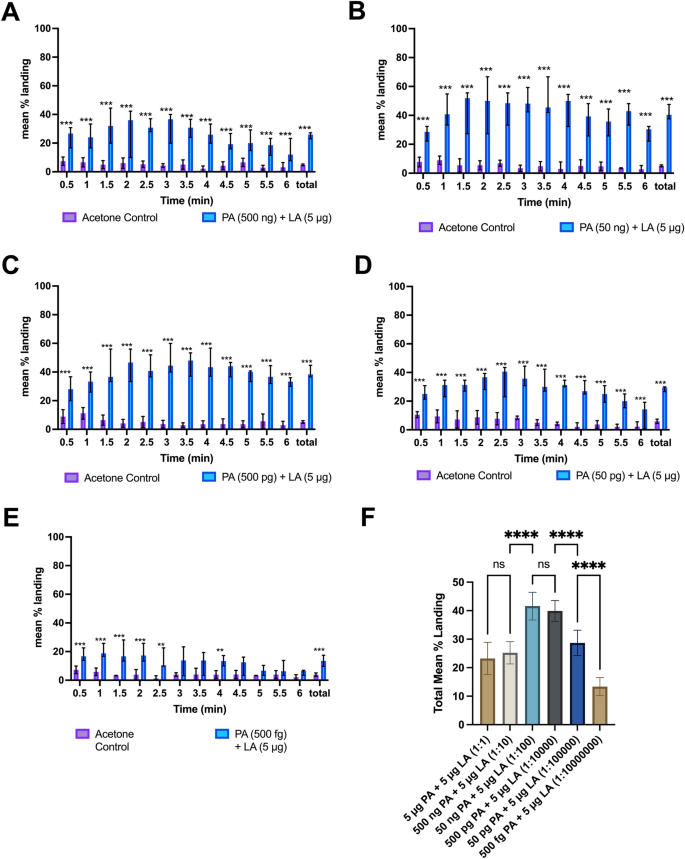 为了确定这两组混合物成分配比的变化对降落是否产生影响,Cardé和Bello测试了1:10~1:100,000比例的2-KGA+LA组合和1:10~1:10,000,000比例的PA+LA组合。由于乳酸是人体汗液的最主要成分,这些配比中乳酸的含量都保持在5µg不变。结果显示,对于2-KGA+LA组合,当2-KGA的剂量降低到5ng(1:1000)以下,将导致降落率显著减少(P<0.0001,图3)。对于PA+LA组合,当PA剂量在50ng(1:100)和500pg(1:10,000)时,降落率相比更高的PA剂量发生了显著的提升,而当PA剂量继续下降时,降落率又发生了回落(图4)。