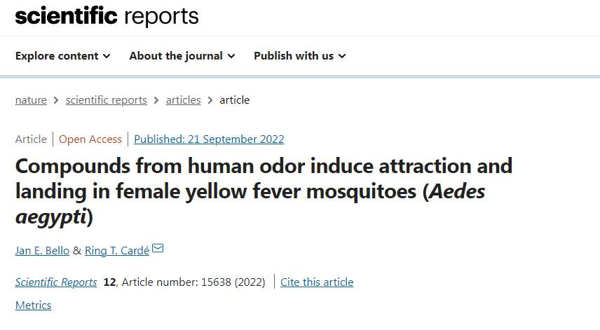参考资料:[1]Bello, J.E., Cardé, R.T. Compounds from human odor induce attraction and landing in female yellow fever mosquitoes (Aedes aegypti). Sci Rep 12, 15638 (2022). https://doi.org/10.1038/s41598-022-19254-w[2]https://news.ucr.edu/articles/2022/09/21/chemical-cocktail-skin-summons-disease-spreading-mosquitoes