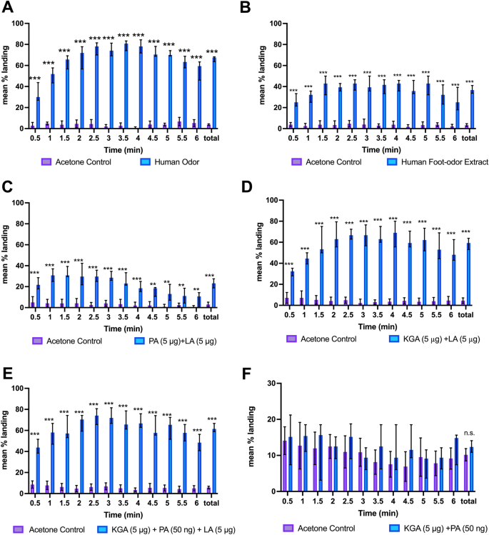 Cardé和Bello在一个充斥着4%浓度二氧化碳的小笼子中投放蚊子,并在6分钟内每隔30秒测算这些蚊子被人类脚臭沾染的玻璃珠吸引降落或被对照组玻璃珠吸引降落的百分比。结果显示脚臭玻璃珠引起了66.8±0.84%的平均降落,而对照组的平均降落率仅为3.72±0.27%(P<0.0001,图2A,视频S1)。