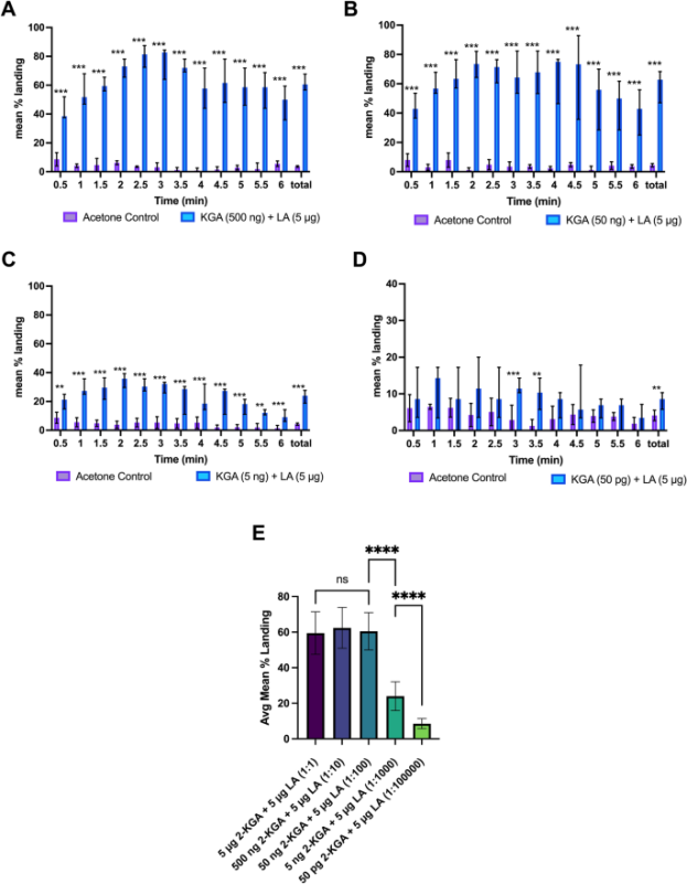 Cardé和Bello随后测试了PA+LA组合和2-KGA+LA组合,以及PA、LA、2-KGA单独的降落率。PA+LA的平均降落率为22.74±1.56%(P<0.0001),与馏分66-67相当。2-KGA+LA的平均降落率为58.19±2.35%(P<0.0001)。单独成分均未引起更高的降落反应,表明PA+LA和2-KGA+LA这两组混合物成分之间存在很强的协同作用。