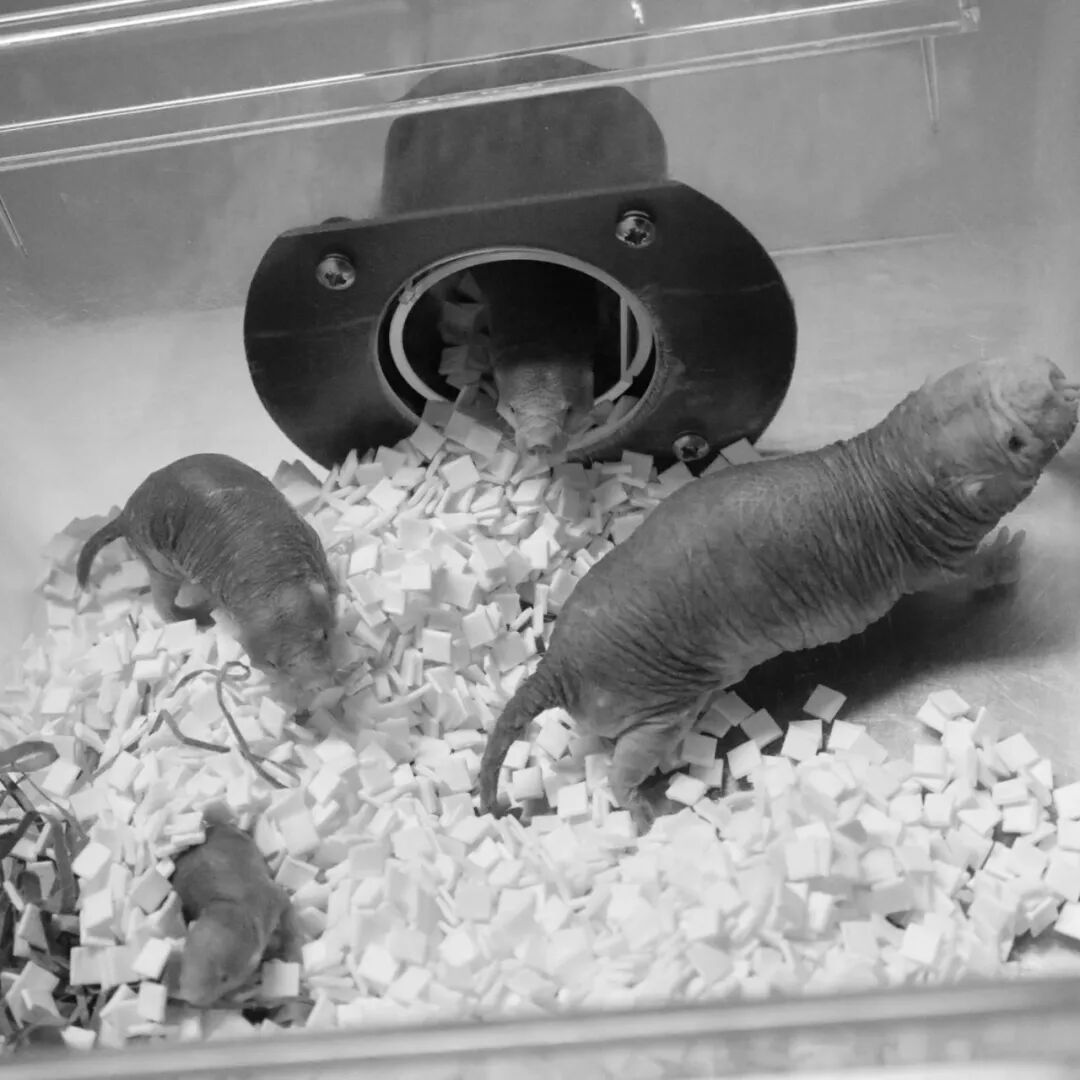 而在实验室中,它们必须生活在30摄氏度的环境中,研究人员常常需要在笼子下方铺上“电热毯”。这些小家伙通常会在笼子里睡成一团,从而保存热量。实验室还必须保持湿润,否则裸鼹鼠的皮肤会起皮。为了模仿它们的野生洞穴,它们的笼子常常要开着红灯,还会通过隧道连接,这也意味着大量空间。