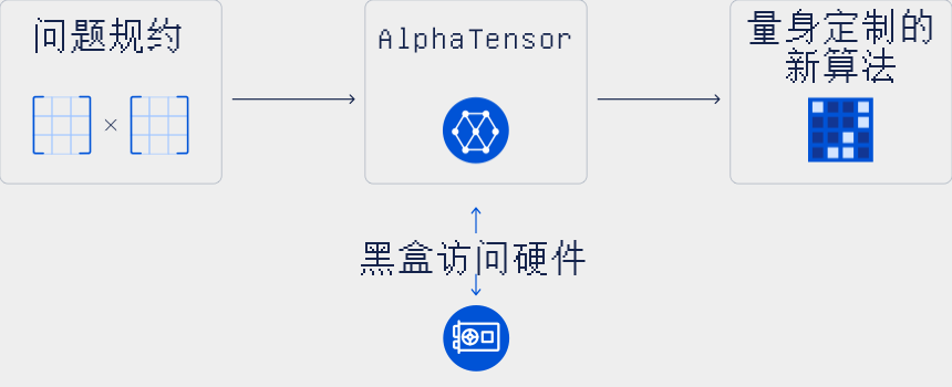 AlphaTensor具有一个对应于算法的运行时间的目标。当AlphaTensor发现正确的矩阵乘法算法时,就会在目标硬件上对其进行基准测试,然后反馈给AlphaTensor,以便在目标硬件上学习更高效的算法。(图/DeepMind)