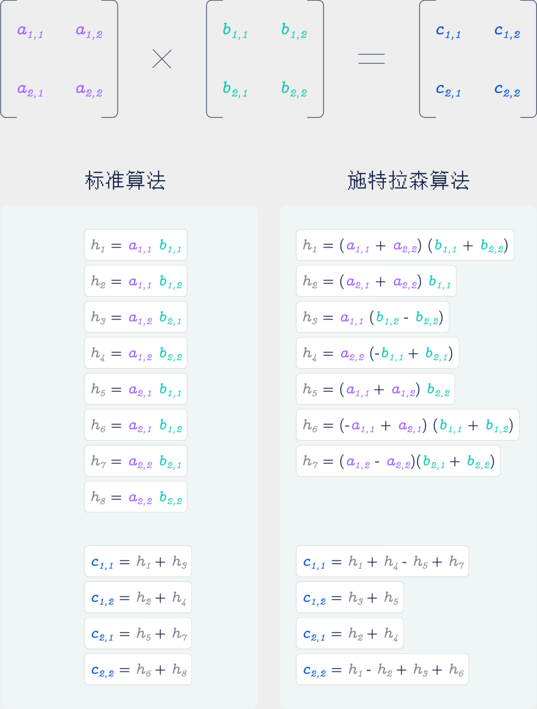 这种算法被称为施特拉森算法,这种算法需要进行多一些的加法,但这是可以接受的,因为计算机在计算加法时要比计算乘法快得多。